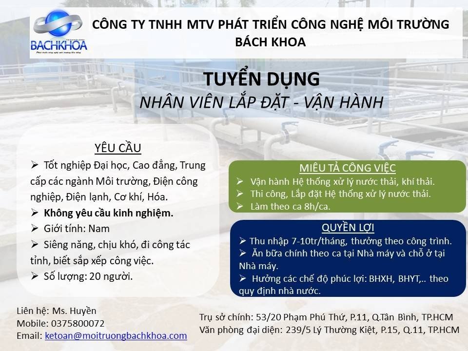 CÔNG TY TNHH MTV PHÁT TRIỂN CÔNG NGHỆ MÔI TRƯỜNG BÁCH KHOA TUYỂN DỤNG NHÂN VIÊN LẮP ĐẶT – VẬN HÀNH