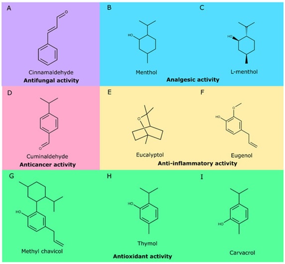 Các hợp chất có hoạt tính sinh học với ứng dụng tiềm năng trong dược phẩm gồm (e)-cinnamaldehyde (kháng nấm, hình 1.A); menthol và l-menthol (giảm đau, hình 1.B-C); cuminaldehyde (chống ung thư, hình 1.D); eucalyptol và eugenol (chống viêm, hình 1.E-F); thymol, carvacrol và methyl chavicol (chống oxy hóa, hình 1.G-H-I). Một số hợp chất được tìm thấy trong tinh dầu gần đây với các hoạt tính sinh học mới như: các monoterpen (thymol, carvacrol và p-cymene) giúp làm giảm khí phế thủng (emphysema) và giảm viêm phổi; eugenol có hoạt tính chống lại một số ký sinh trùng.