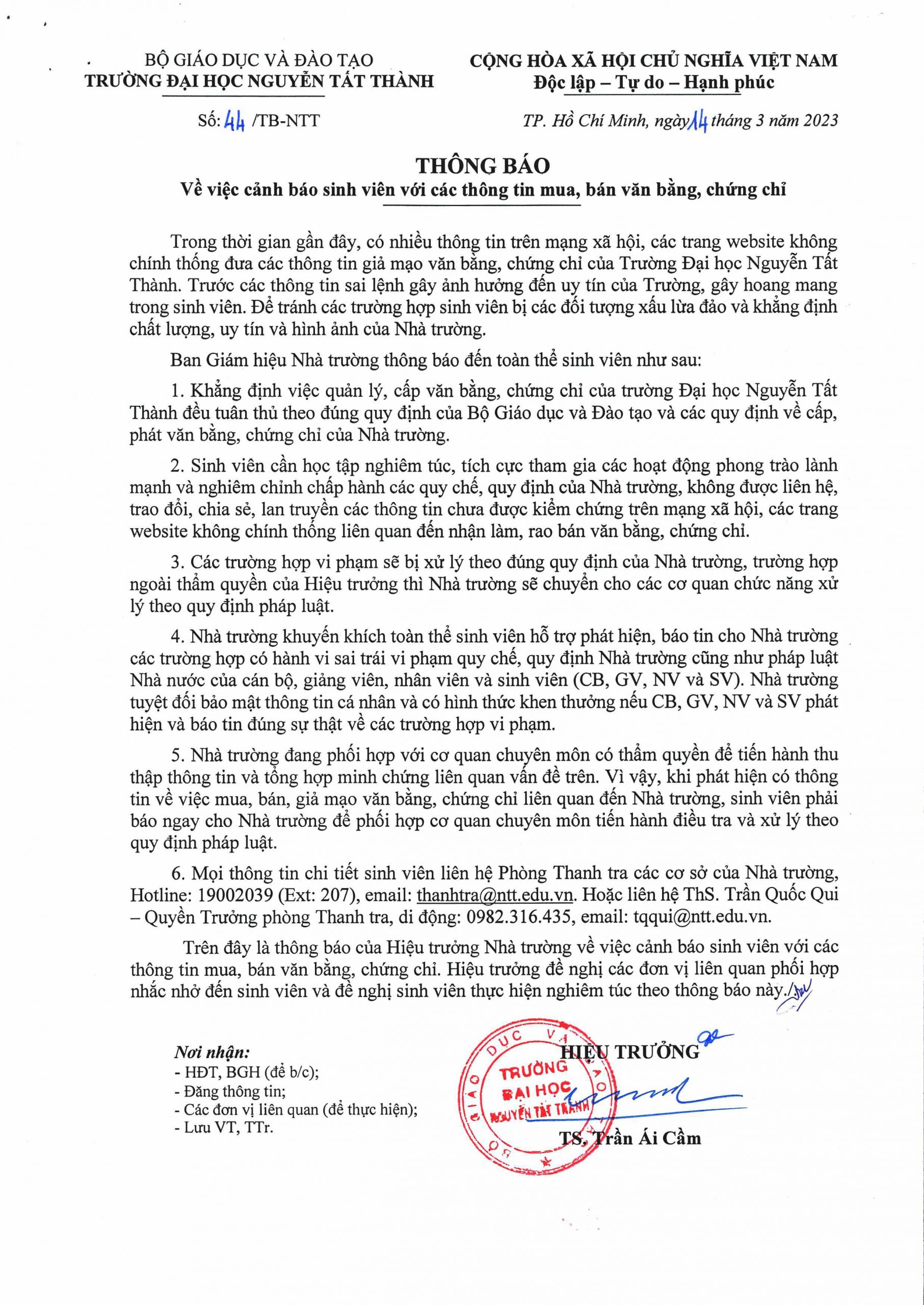 THÔNG BÁO VỀ VIỆC CẢNH BÁO SINH VIÊN VỚI CÁC THÔNG TIN MUA, BÁN VĂN BẰNG CHỨNG CHỈ